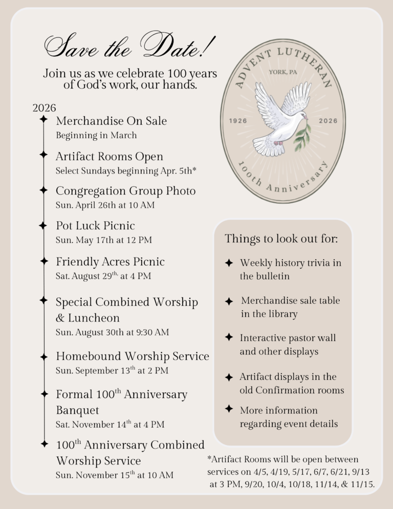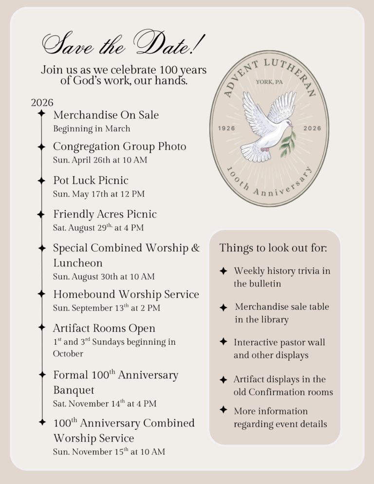 Advent Lutheran Church joyfully invites you to celebrate its 100th Anniversary ! Embracing our theme, “100 Years: God’s Work, Our Hands,” we honor a century of faith, service, and community. Detailed invitations and event information forthcoming. Prepare to rejoice in this milestone with us!